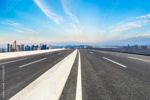 © ABCDstock, Fototapeta premium Empty asphalt road and city skyline at sunrise in hangzhou,high angle view