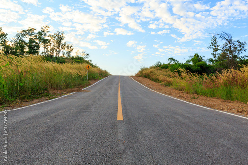 © CHARAN, Fototapeta premium empty asphalt road and floral field of yellow grass