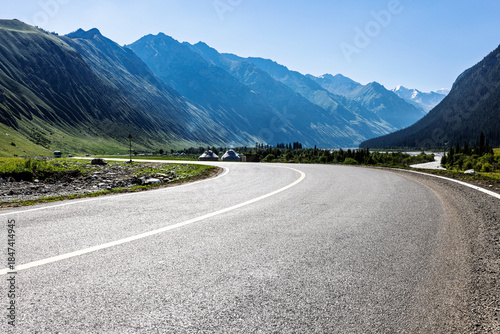 © ABCDstock, Naklejka premium Empty asphalt road and green mountain natural landscape under blue sky