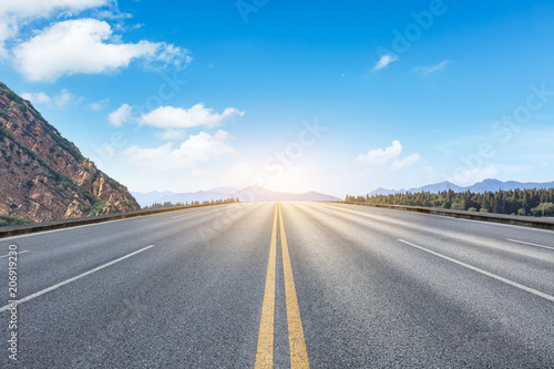 © ABCDstock, Naklejka premium Empty asphalt road and hills with sky clouds landscape