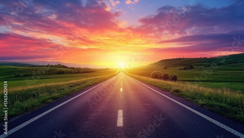 © Muhammad, Naklejka premium Empty asphalt road extending into a vibrant sunset over rolling hills