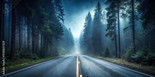 © Praphan, Obraz premium Empty asphalt road in a dark forest with fog, rural solitude, night scene