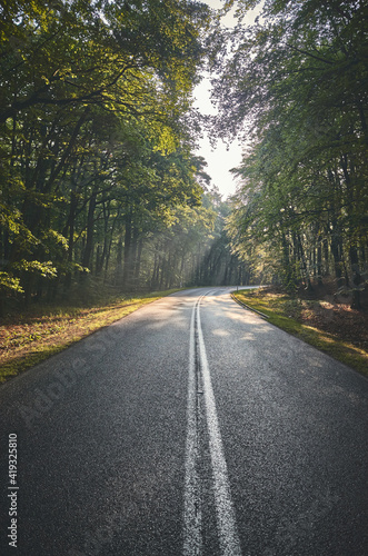© MaciejBledowski, Obraz premium Empty asphalt road in a forest, selective focus.