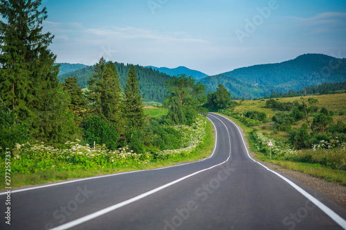 © okostia, Fototapeta premium Empty asphalt road in Carpathian mountains among forests and fields