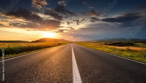 © Ava, Fototapeta premium empty asphalt road in rural landscape at dramatic sunset