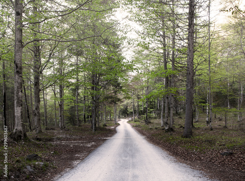 © Andrea, Fototapeta premium Empty asphalt road in the misty forest