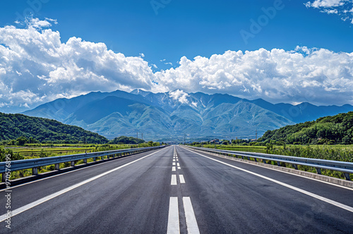 © oksa_studio, Naklejka premium Empty asphalt road leading to distant mountains under blue sky with clouds