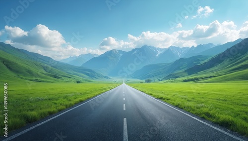 © Vadym, Naklejka premium Empty asphalt road leads between green fields mountains. Under blue sky with fluffy white clouds. Scenic landscape. Trip, travel, journey concept. Nature, travel, freedom, tourism background.
