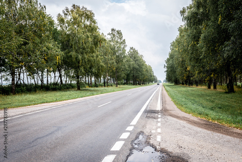 © Natallia, Fototapeta premium Empty asphalt road surrounded by deciduous summer forest