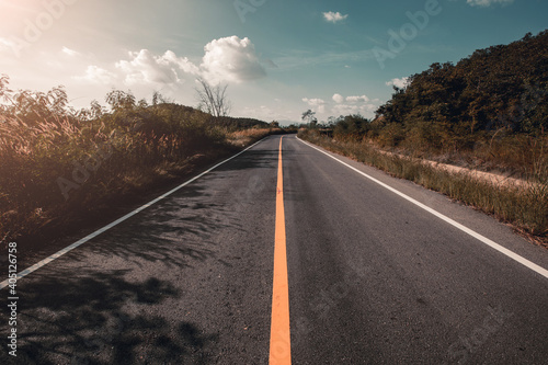 © ATKWORK888, Fototapeta premium Empty asphalt road through the green field and clouds on blue sky.