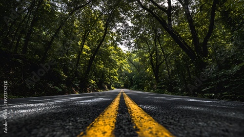 Fototapeta premium Empty asphalt road winding through a dense green forest with sunlight