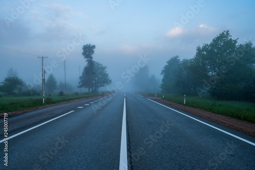 © Martins Vanags, Naklejka premium empty asphalt road with white lines painted in misty morning