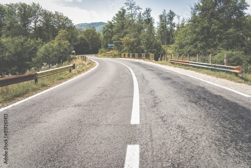 © Cristi, Fototapeta premium Empty asphalt street road in the mountains through the pine forest in Romania.