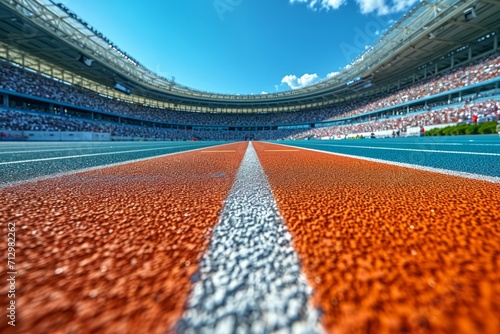 © ParinApril, Naklejka premium Empty athletic running tracks in a stadium filled with spectators.