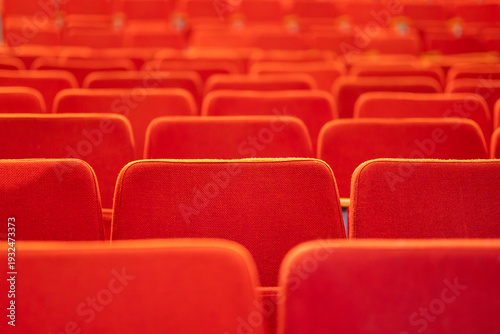 Naklejka premium empty auditorium or theater with red velvet seats, no audience, background.