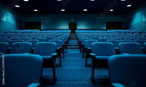 Naklejka premium Empty auditorium seating, dim lighting, center aisle, presentation/lecture hall