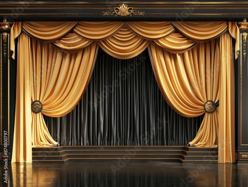 © Johannes, Fototapeta premium Empty background - Theater stage with black gold velvet curtains (Generative Ai)