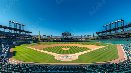 © Matthias, Obraz premium Empty baseball stadium with maintained field and large scoreboard
