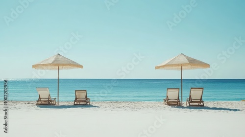 Fototapeta premium Empty beach chairs and umbrellas on a quiet holiday shore, leaving space for text.