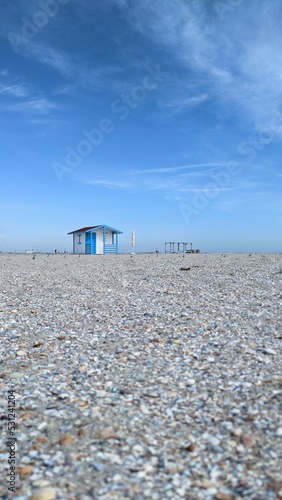 © *** ***, Obraz premium Empty beach with a single blue sea house under clear blue sky