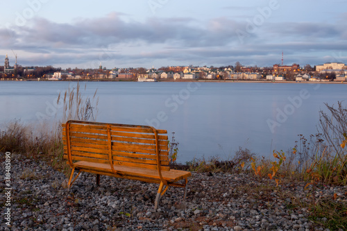 © Aleksey, Obraz premium Empty bench by the river