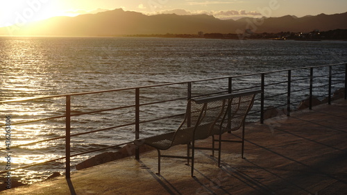 © Esteve, Obraz premium empty bench by the sea at sunset