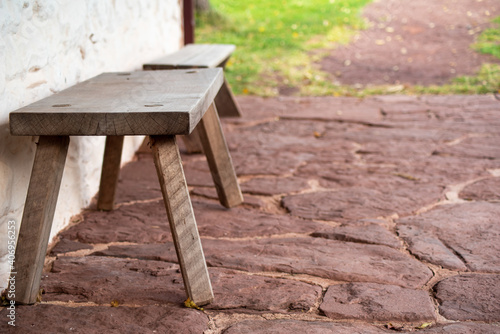 Fototapeta premium Empty bench on a colonial flagstone porch