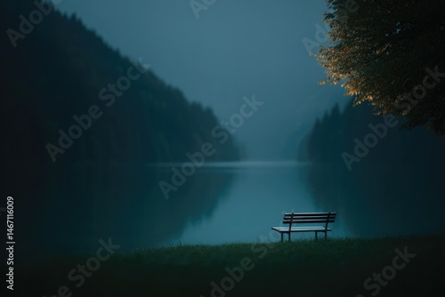 © Maria, Obraz premium empty bench sits quietly beside tranquil lake pensive mood enveloping scene perfect minimalistic atmosphere