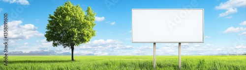 © JK_kyoto, Obraz premium Empty billboard in a green field under blue sky