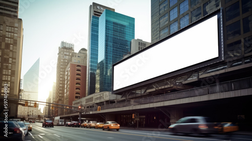 © Konstantin Yuganov, Fototapeta premium Empty billboard on the building. Blank mock-up of an outdoor info banner. Generative AI