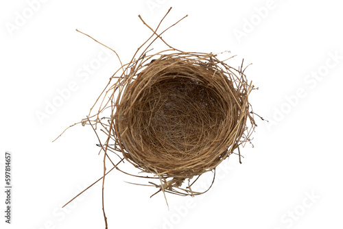 Obraz premium Empty bird nest isolated on white background. Top view. Clipping path