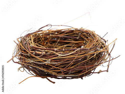 © Golam, Obraz premium Empty Birds Nest Made of Twigs on Black Background Still Life