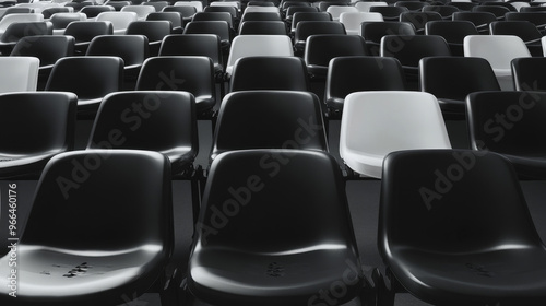 © Mahmud, Fototapeta premium "Empty black and white stadium seats arranged in rows, highlighting a concept of diversity."