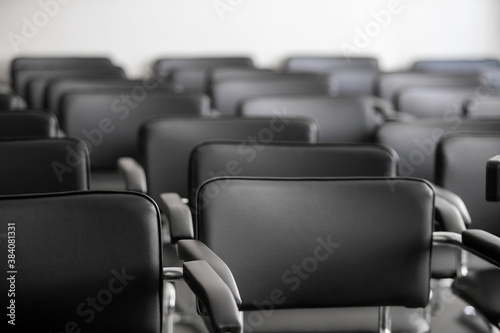Fototapeta premium Empty black chairs stand in conference hall