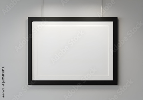 © joe, Obraz premium Empty black framed picture on a light gray wall. Empty display mockup for art or a presentation. Professional office setting. Use for design or art inspiration.