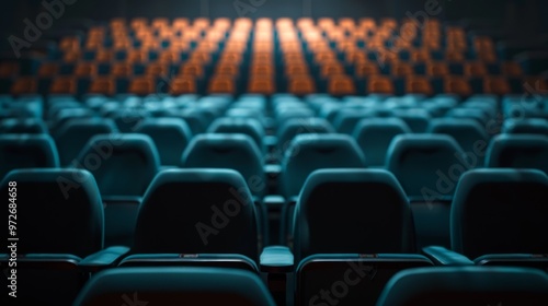 © Virtual Art Studio, Obraz premium Empty blue cinema seats with the screen and spotlight in the background.