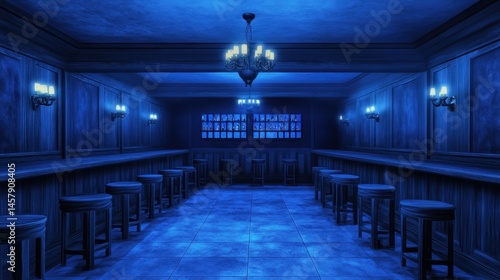 © Solikah, Fototapeta premium Empty blue lit bar interior at night