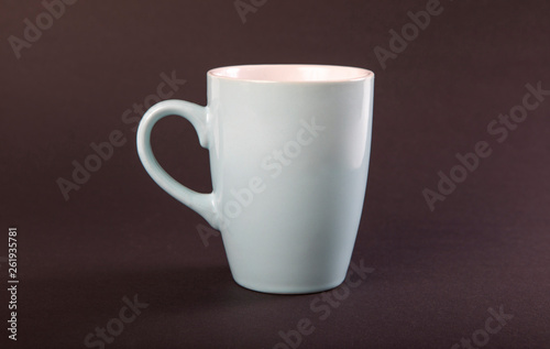 Obraz premium Empty blue mug on a brown table.