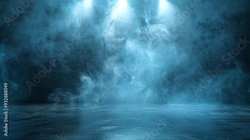 © Shanorsila, Fototapeta premium Empty Blue Stage with Spotlight and Smoke Effects: A Dramatic and Atmospheric Performance Space