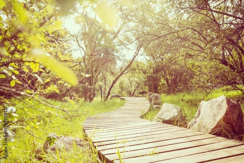 © vectorfusionart, Fototapeta premium Empty boardwalk amidst trees