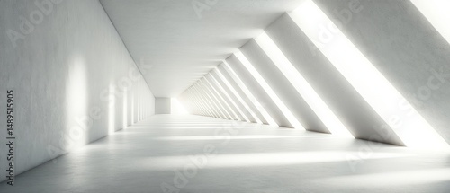 © smalltinykid, Naklejka premium Empty bright modern hallway with strong diagonal beams of natural light creating geometric shadows on the floor and walls, evoking a serene and minimalist atmosphere