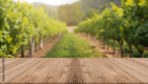 Fototapeta premium Empty brown wooden table with blurred vineyard backdrop, ideal for product...