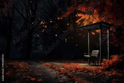 © nsit0108, Fototapeta premium Empty bus stop bench waiting for passengers during an autumn night