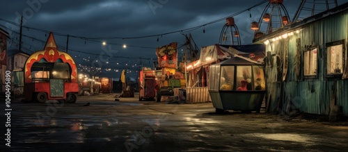 Fototapeta premium Empty carnival booths and a Ferris wheel stand lit by string lights under a...