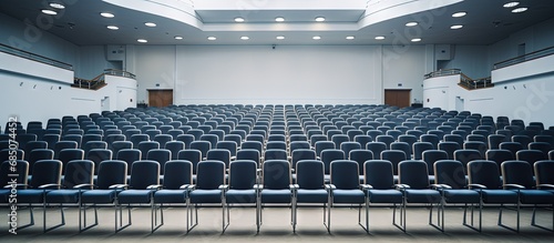 Fototapeta premium Empty chairs lined up inside a spacious conference hall for a corporate convention or lecture copy space image