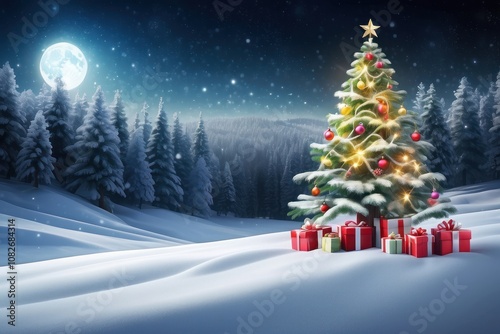 © AHMAD TAUFK, Obraz premium empty christmas table background with christmas tree out of focus for product display montage
