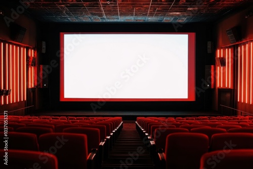 Fototapeta premium Empty cinema auditorium with red lighting and a large blank screen in...