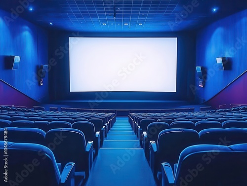 Fototapeta premium empty cinema hall bathed in deep blue light, showcasing a blank white screen. the absence of people emphasizes the stillness, creating a space for imagination