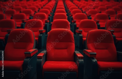 © miss irine, Fototapeta premium Empty cinema hall with red seats. Modern movie theatre interior design with rows of comfortable armchairs. Auditorium with empty stage prepared for show. Perfect for entertainment concepts.
