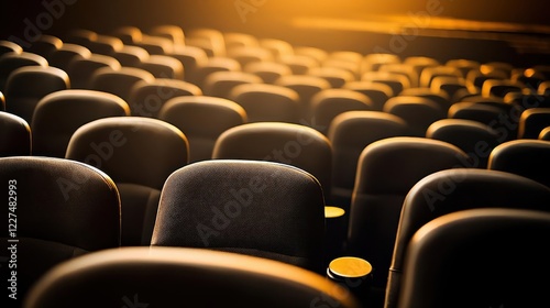 © Onzdemia, Fototapeta premium Empty cinema seats awaiting moviegoers in dim lighting.